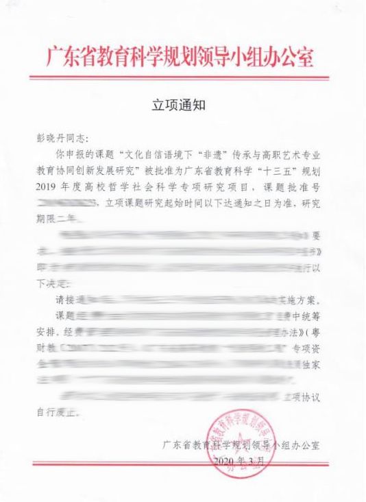 2020年3月,艺术设计系主任、环境艺术设计专业专任教师彭晓丹的科研课题“文化自信语境下“非遗”传承与高职艺术专业教育协同创新发展研究”批准为广东省教育科学“十三五”规划 2019 年度高校哲学社会科学专项研究项目。这是环艺、建装、风景园林专业教师在非遗研究方面取得的另一重大突破。