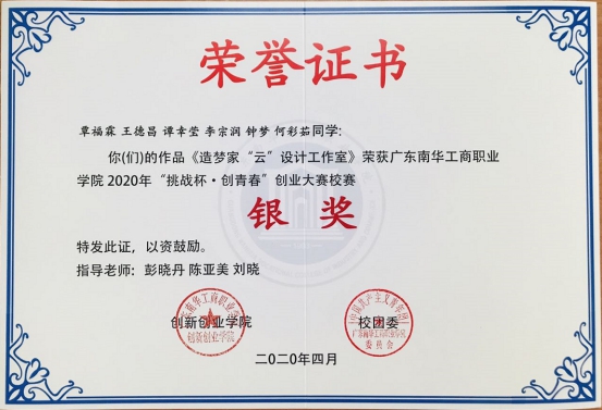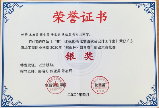 为进一步推进第十二届“挑战杯.创青春”广东大学生创业大赛,2019.2月初开始,建装专业与环艺专业教师彭晓丹、陈亚美、刘晓老师就大赛相关筹备方案、执行细则等方面进行工作对接与热烈讨论,并就下一步辅导学生,经4个多月的修改、打磨、路演、等不同的关卡,经我校审查、校内专家组评审推荐、校外专家评审,我院的钟梦、王德昌、谭幸莹、李宗润、覃福霖、何彩如的作品“非你莫属-粤北非遗软装设计工作室和造梦家“共享设计”工作室分别获得9999js金沙老品牌2020年“挑战杯.创青春”创业大赛校赛的银奖.