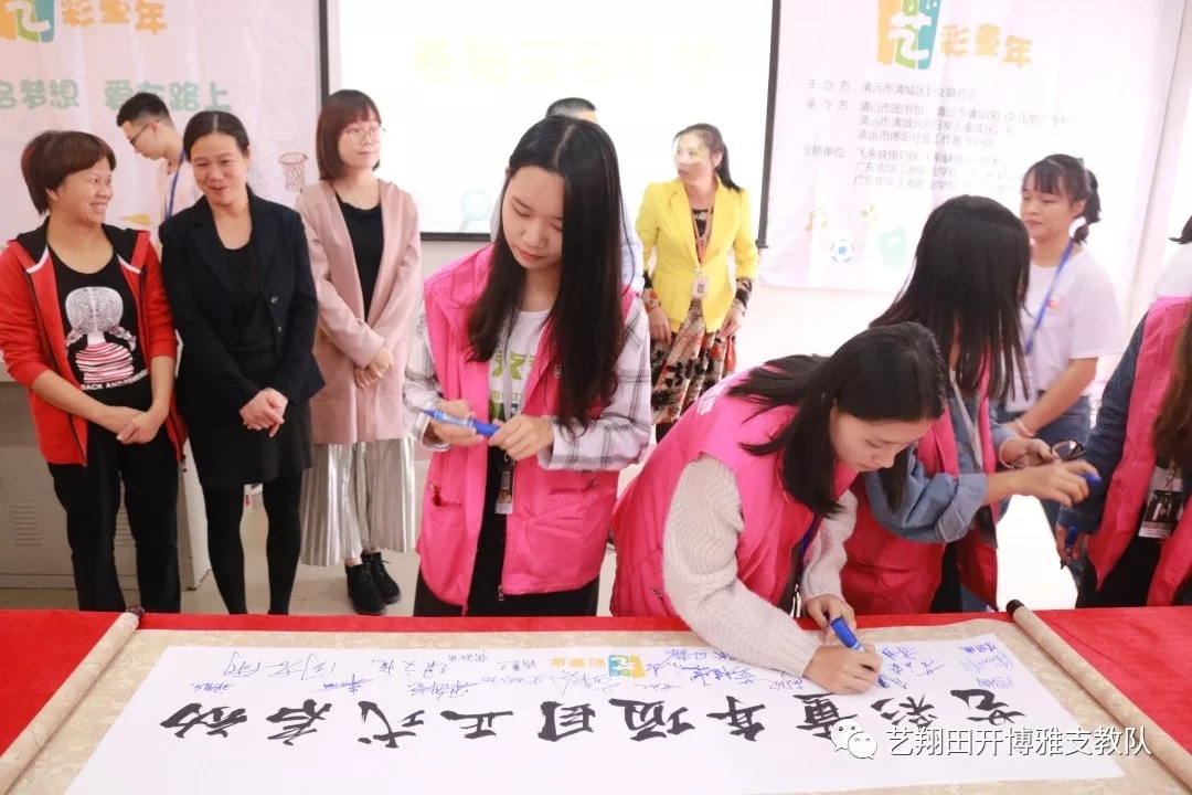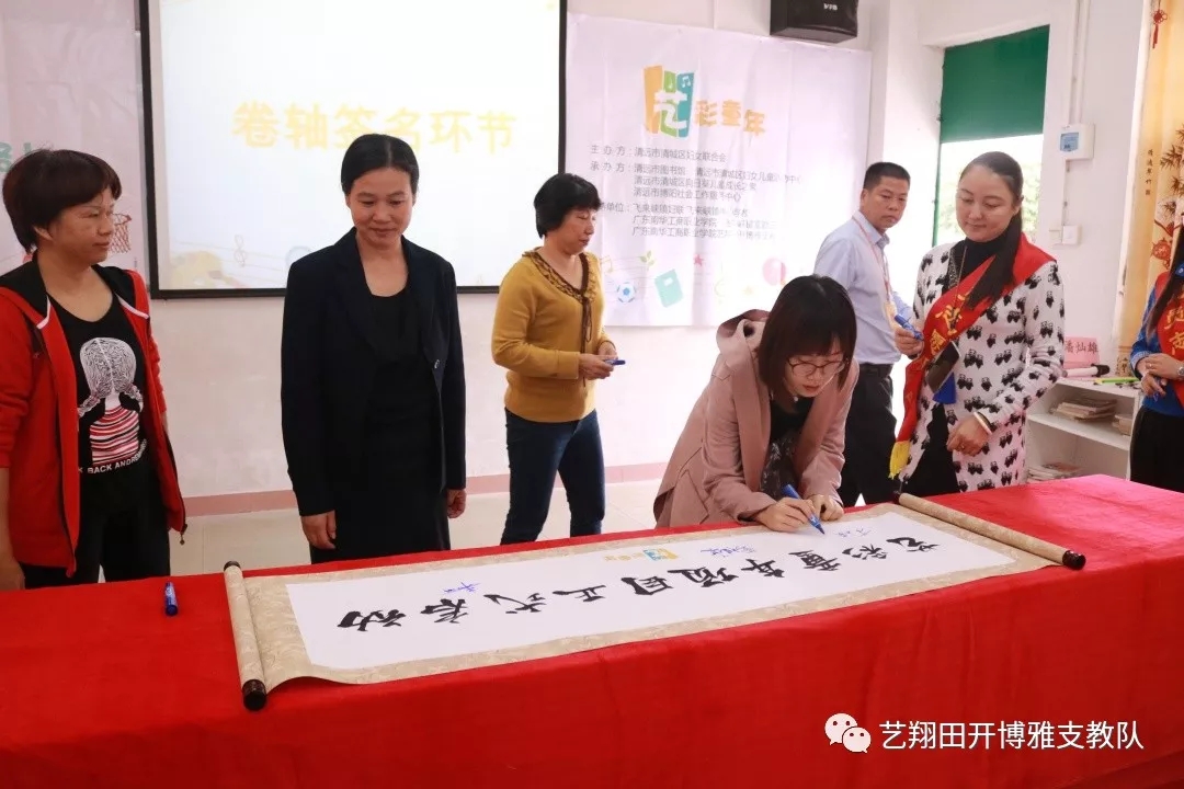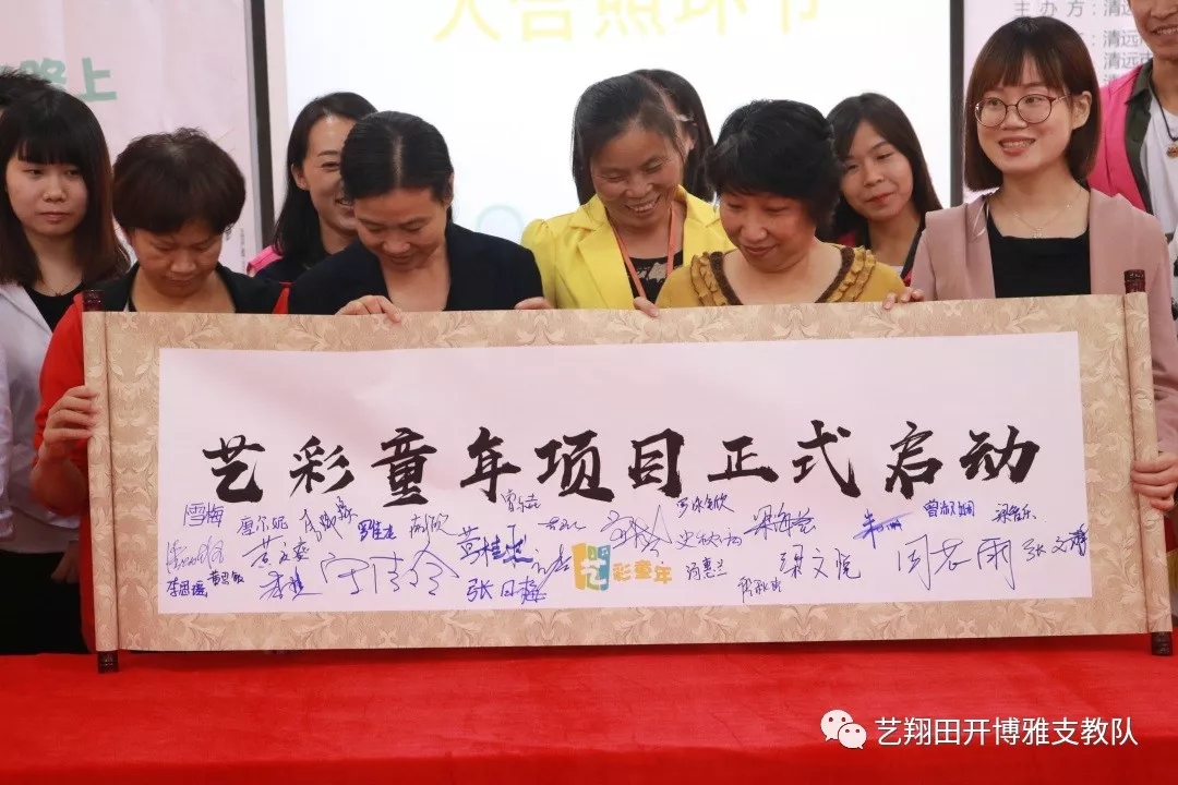 最后,各位到场的嘉宾一起上台在艺彩童年项目启动的卷轴上签名留念,共同见证艺彩童年项目的正式启动,共同祝愿孩子们的能健康发展与成长。