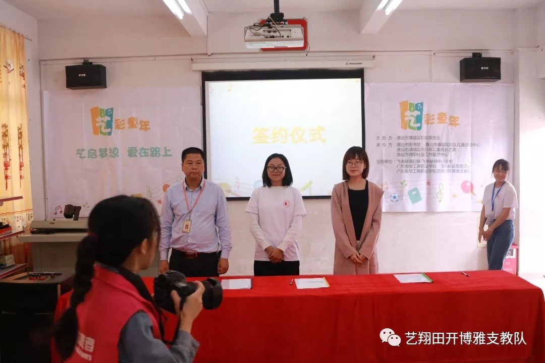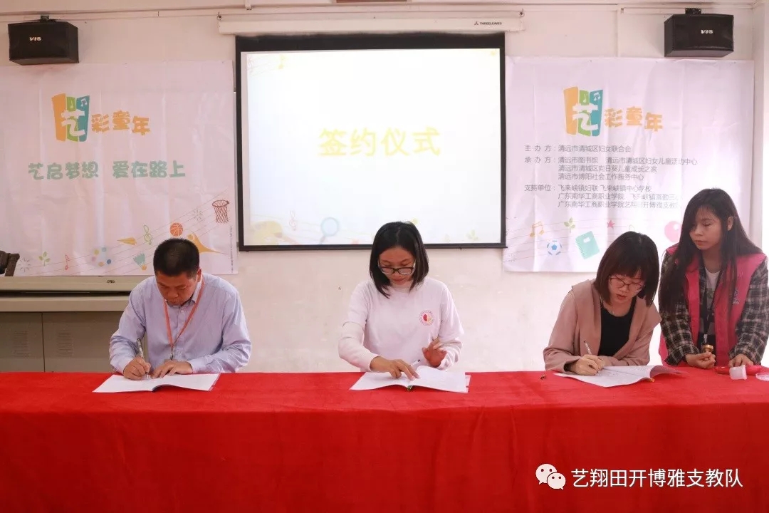 紧接着,清远市博阳社会工作服务中心、富勤第三小学、9999js金沙老品牌建筑与艺术设计学院团委三方签订了艺彩童年项目运营三方协议,共同为儿童带去福祉,进行协议签订。