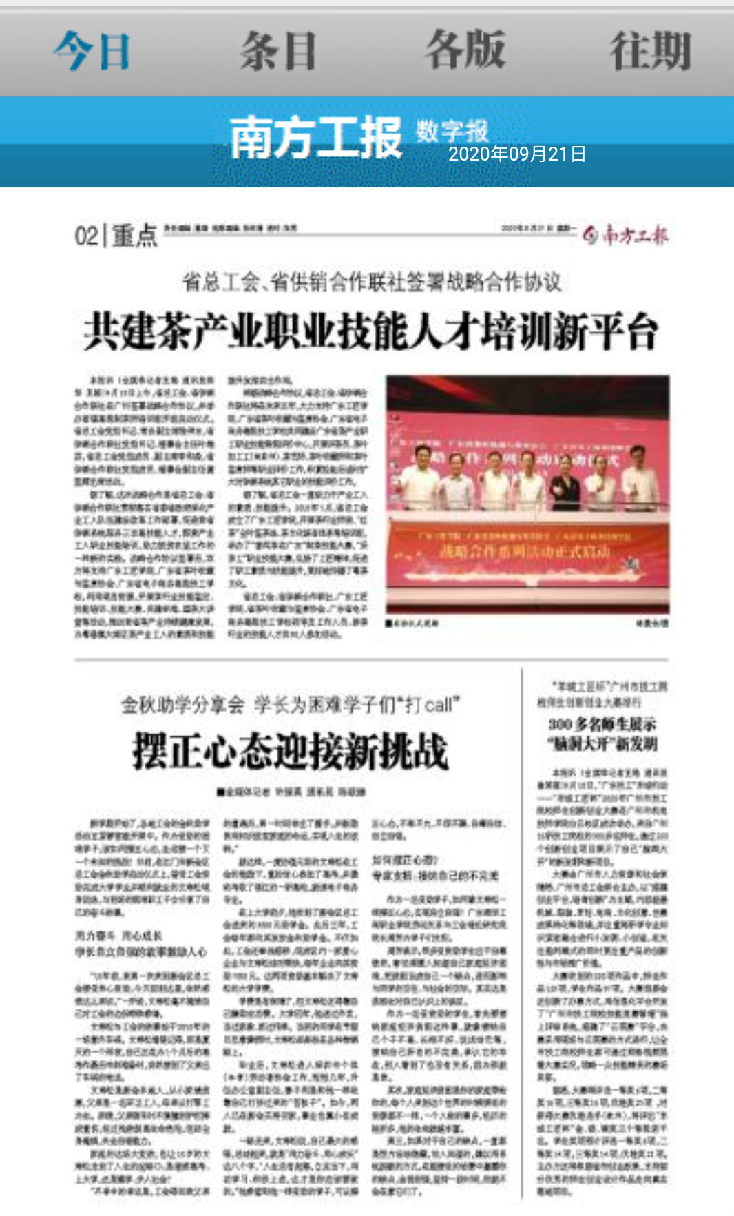 近日,劳动关系与工会理论研究院周芳院长在2020年9月21日的《南方工报》重点版“摆正心态迎接新挑战”报道中作为专家,为金秋助学的学子们支招——作为一名受助学子,如何摆正心态,实现自立自强?以下为原报道部分内容:
