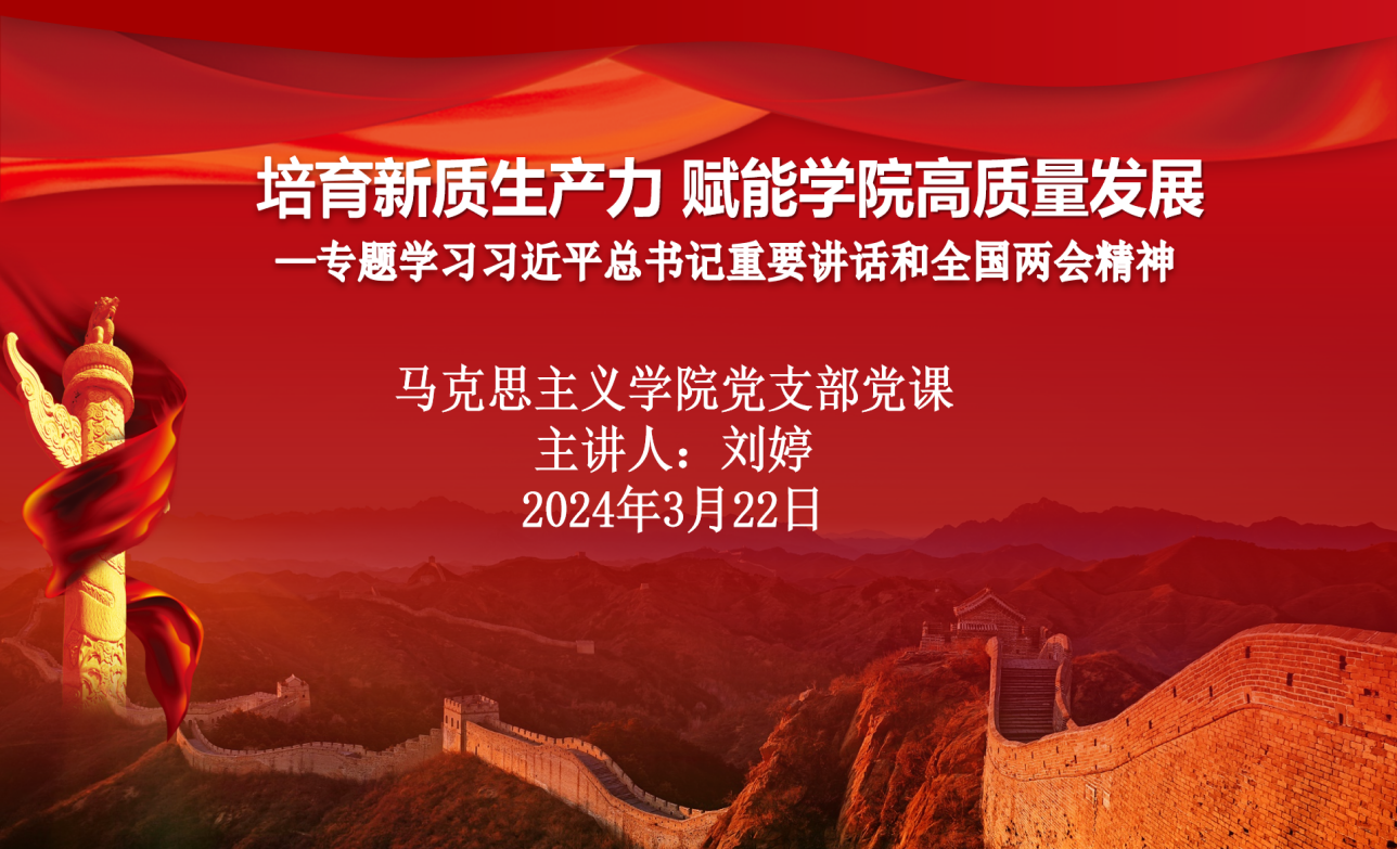支部书记刘婷教授作了主题为《培育新质生产力,赋能学院高质量发展》的主题党课。刘婷书记从新质生产力全新理念的提出、新质生产力丰富内涵的理解、培育新质生产力赋能学院高质量发展三个方面,系统梳理了习近平总书记关于新质生产力的重要论述,阐明了什么是新质生产力,新质生产力对高质量发展的意义,并详细阐述了马克思主义学院要成为新质生产力培育和发展的助推器、思政课是宣传新质生产力的重要途径等,赋能学院高质量发展。
