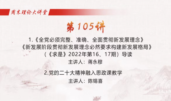此外,全体教师还共同观看了2022年秋季学期全国思想政治理论课教师“周末理论大讲堂”第105讲的直播以及开展了第31期“每周一学”的相关学习。