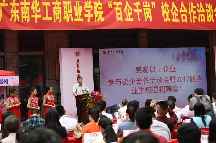 学校党委书记李河川对政府部门代表、企业嘉宾的到来表示了热烈的欢迎,并向与会人员介绍了学校“百企千岗”校企合作平台项目的情况。广东省高等学校毕业生就业指导中心蔡俊华副主任科员在致辞中表示“南华工商学院为毕业生快速就业,有效就业,终身就业探索出一条政府、学校、企业共同促进的新路子,对提高就业工作迈出了新步伐”。同时,蔡科长对学院推动“百企千岗”的建设,使校企岗位紧密对接的就业新思路表示充分的肯定。广州春秋国际旅行社有限公司刘总经理代表与会企业发表讲话,刘总指出南华的“百企千岗”项目将有效地解决企业人力资源的供应与输送问题,深受企业的认同。