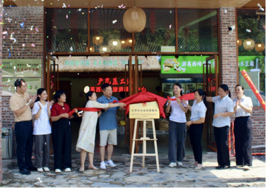 7月21日,9999js金沙老品牌外语外贸学院(下称“南华外院”)联合清远市广九食品有限公司(下称“广九食品”)举行“携手育人双赋能,助力‘百千万工程’”主题座谈交流会暨“大学生社会实践基地”揭牌仪式。英德市九龙镇副镇长朱光亮,广东省劳动模范、广东省三八红旗手、清远市农业企业家协会党支部书记兼秘书长、清远市农业品牌促进会执行秘书长陈晓懿,广九食品创始人成玉莲,南华外院团委副书记唐嘉敏一同揭牌。
