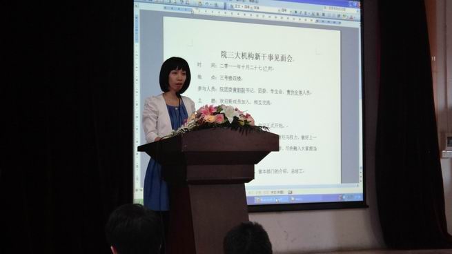 2011年10月27号下午17时,学院学生会、青年志愿者协会、团委在三号楼4楼举行新老干事交流会。参加交流会的有院团委黄韵副书记,院团委、学生会、青协全体人员。