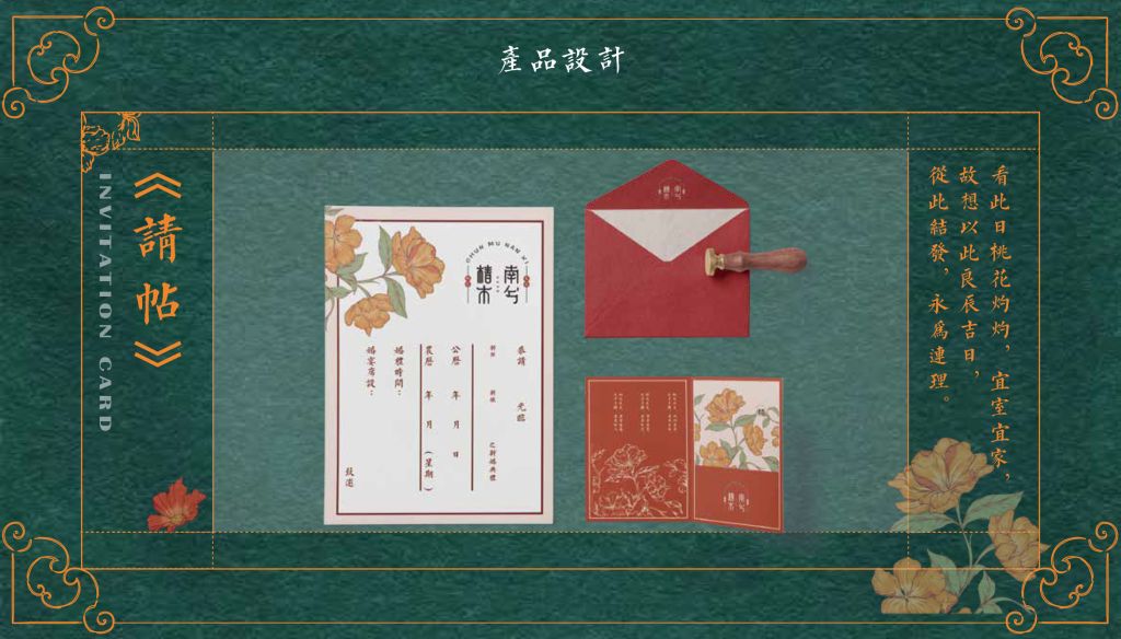 《椿木南兮》是一组婚庆产品设计,以《诗经》中的《桃夭》为设计元素: