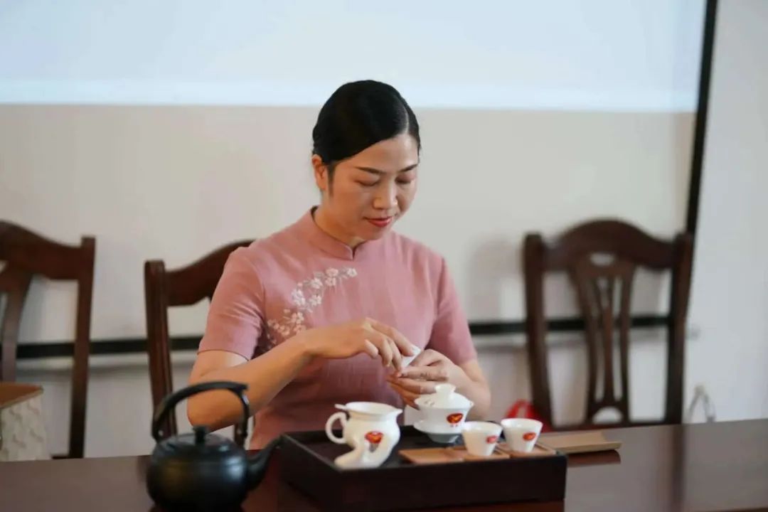 用劳模精神感召人。张扬娣老师以茶为桥,以艺传情,聚焦于茶艺技艺,引领孩子们走进博大精深的茶文化世界。在分步骤茶艺知识教学过程中,张老师进行了个人茶艺展示,她在选茶、备器、冲泡、品鉴的每个环节都恰到好处。悠然琴音、轻盈动作、优雅仪态,孩子们在张老师展示茶艺的举手投足之间,不仅感受到茶艺之美,更深刻的领略到其匠心独运的设计。