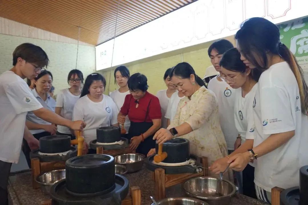 此外,陈晓懿还与豆“富”筑梦实践团师生一同劳动,体验非遗豆腐制作工艺,体悟劳动之美。陈晓懿一边忙碌,一边不时地鼓励着同学们,她的话语温暖而充满力量:“同学们,劳动不仅塑造了我们的双手,更塑造了我们的心灵。我们要珍惜每一次亲手创造的机会,将劳模精神、劳动精神、工匠精神‘三种精神’深深根植于心。用双手去创造更多可能,为乡村振兴这幅宏伟蓝图添上属于我们青春的一笔。”