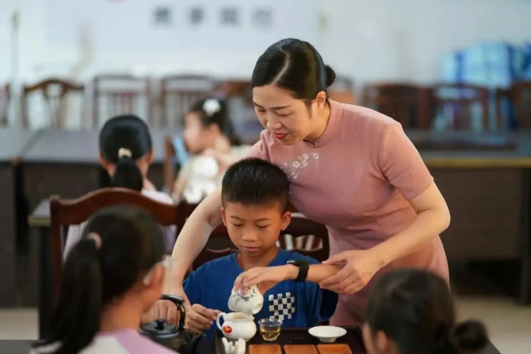 用劳动精神培养人。在张老师的悉心指导下,孩子们开始亲手尝试泡茶步骤,一丝不苟地摆弄茶具、控制水温、投放茶叶。泡好茶后,孩子们满脸自豪和满足。孩子们从起初对茶具的生疏摆弄,到后来能够精准泡茶,在一杯杯香气扑鼻的茶成功泡出后,孩子们不仅感受到茶文化的深厚广博,更深切体悟到唯有亲身劳作,方能获得真知灼见,畅享学习的乐趣,领会知识的珍贵价值