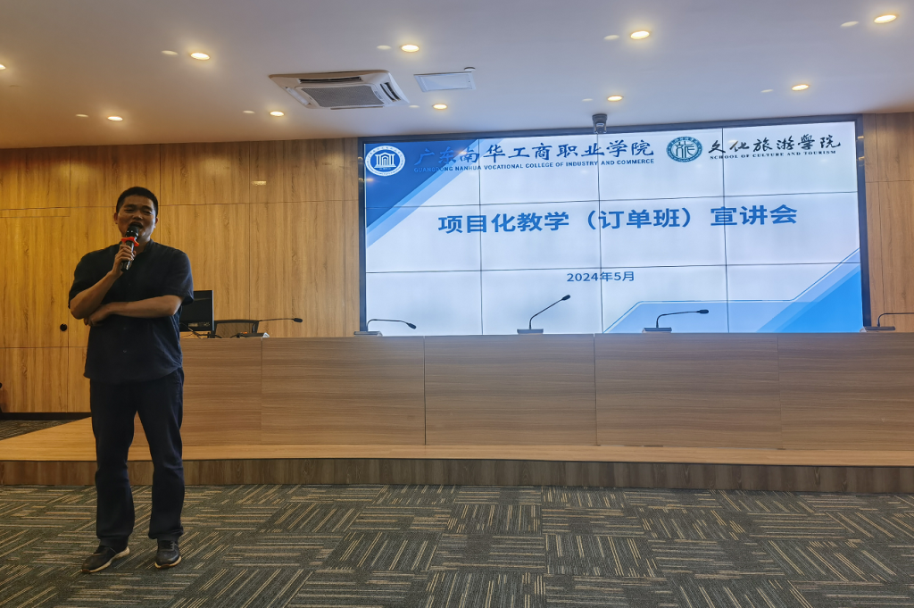 为进一步深化产教融合、校企合作,推动职业教育教学改革,在学校的统一工作部署下,5月27日晚,文化旅游学院在清运校区图书馆一楼方形报告厅召开了项目化教学宣讲会。文化旅游学院谭金凤副院长、梁滔滔副院长、专业负责人刘又榕、马佩佩、张彭博、胡宇子、辅导员岑锦明、教学秘书陈健玲老师以及全院22级学生、23级中高班学生约300人参加本次会议。会议由梁滔滔副院长主持。