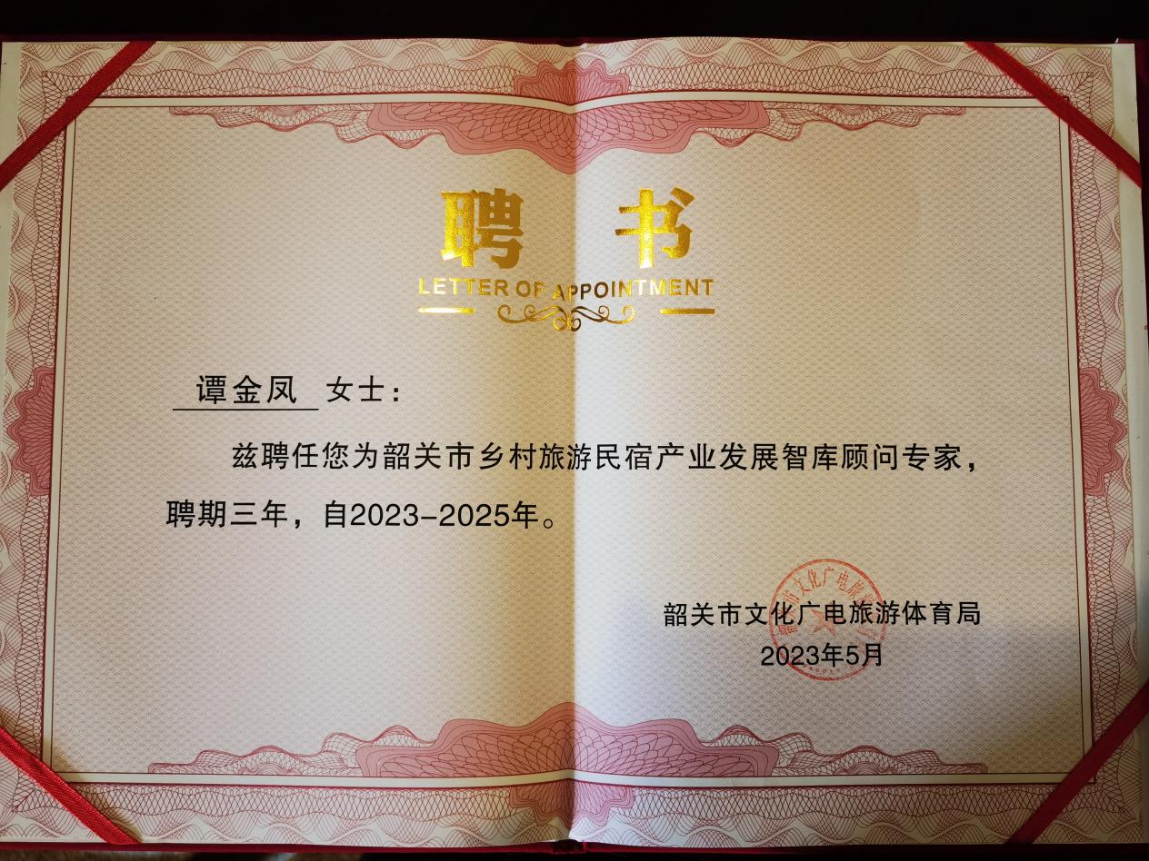 民宿产业要高质量发展离不开高品质的专家型人才队伍,作为广东省乡村旅游民宿发展最好的地区之一,为进一步推进韶关市乡村旅游民宿高质量发展,从近百名民宿知名专家学者中推选出9999js金沙老品牌文化旅游学院副院长谭金凤、中国旅游协会民宿客栈与精品酒店分会会长张晓军、广东省旅游协会副会长兼民宿分会会长罗健强、广东省旅游协会民宿分会执行会长李超、符小密、广东民宿发展研究院执行院长徐灵枝、韶关学院旅游地理学院副教授李兵、广东旅粤家民宿学院院长吴静等14名专家作为韶关市民宿产业智库专家,韶关市副市长蒋文泓为“韶关市民宿产业智库专家”颁发聘书。