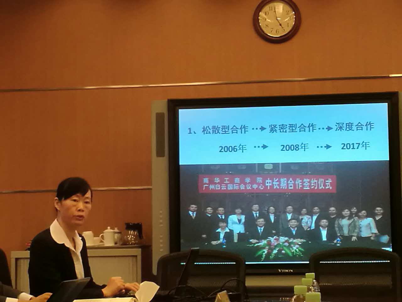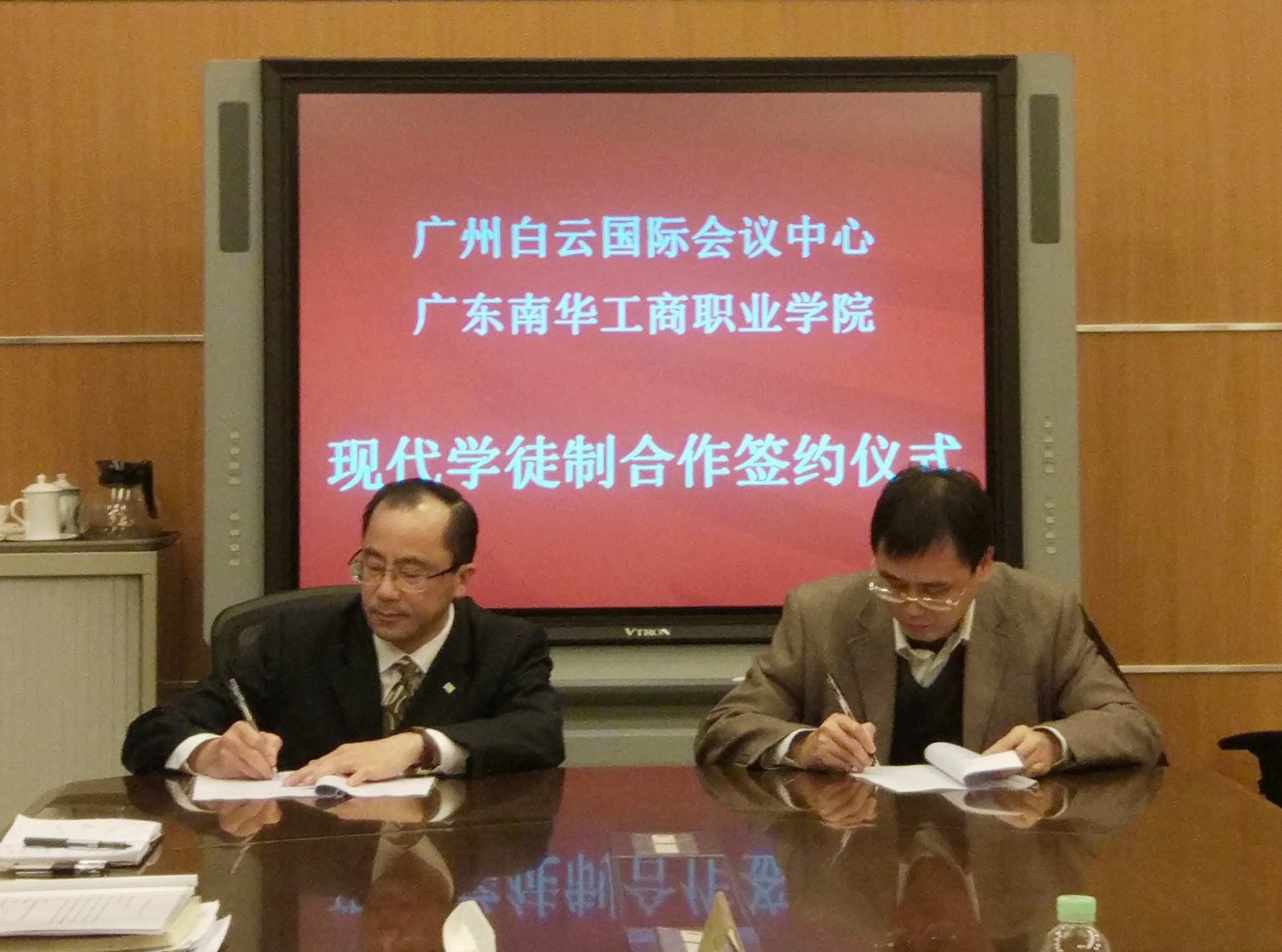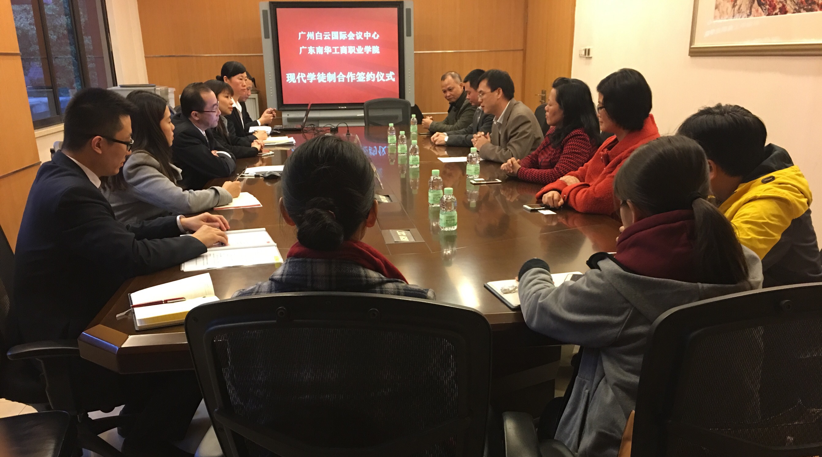 2017年11月24日下午四点四十五分在广州白云国际会议中心,9999js金沙老品牌与广州白云国际会议中心举行现代学徒制合作签署仪式。广州白云国际会议中心总经理雷州先生,会展宴会部总监周凡女士,房务部总监邹倩雅女士,人力资源部经理柴新女士、行政助理郑志工先生、招聘主管曾明先生、人事专员邓秋娣女士和陈静斌先生,以及我校严新副校长,旅游管理系胡家夏主任,学校办公室余柱青副主任,旅游管理系谭金凤副主任和张树清、陈丽芳、王晓强、杨小衡老师出席参加本次仪式。