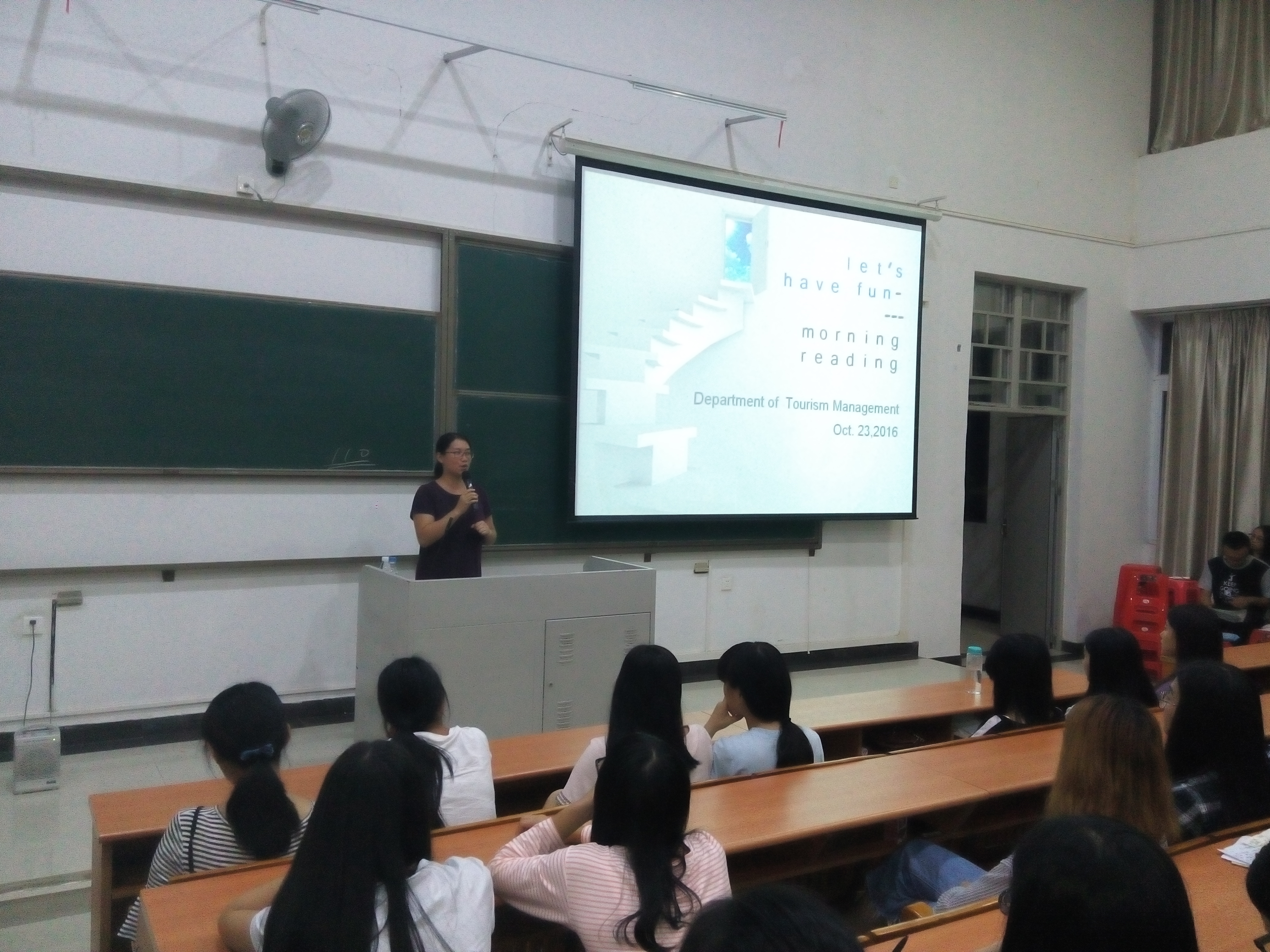 2016年10月23日晚上8点,旅游管理系在清远校区教学楼101课室为全体2016级同学们举行了《英语晨读》课程说明会。本次会议邀请了旅游管理系谭金凤副主任、关惠贞老师、黄隽老师、杨小衡老师出席,并由酒店管理专业负责人陈丽芳老师主持。