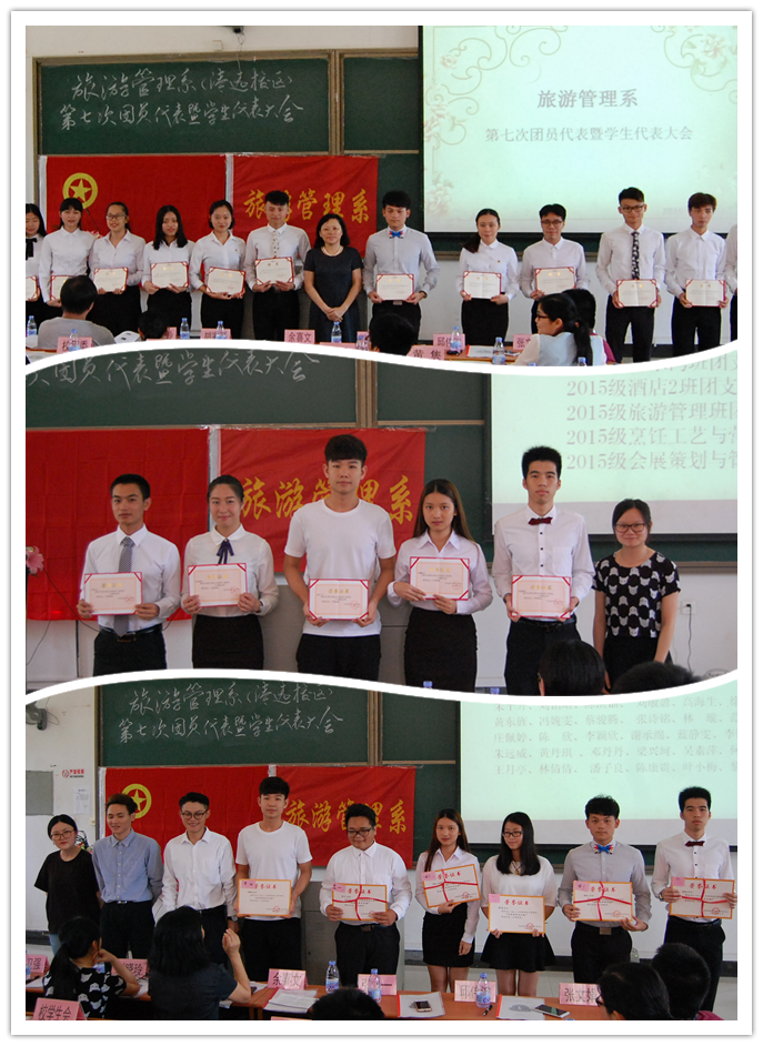 紧接着,25位候选人上台竞选演讲,或慷慨陈词,或娓娓道来,均展现出自己最好的一面。在代表们完成投票后,陆续颁发了旅游管理系2015-2016年度“五四”表彰、第六届干部聘书、第六届团学先进个人、14级辅导员助理聘书、旅游管理系“行行摄摄”摄影展奖项等。现场还观看了过去一年的团学视频,一同回顾那些点点滴滴:纪念抗战70周年团日活动、迎新、新生军训、校外考察、风筝文化节、趣味运动会、新生运动会、旅游大讲坛、植树活动、旅游杯、班级梦想秀暨班级标志大赛、悦读论坛、出彩南华人等等。随后,总监票人熊汝鑫老师向大会报告计票结果。