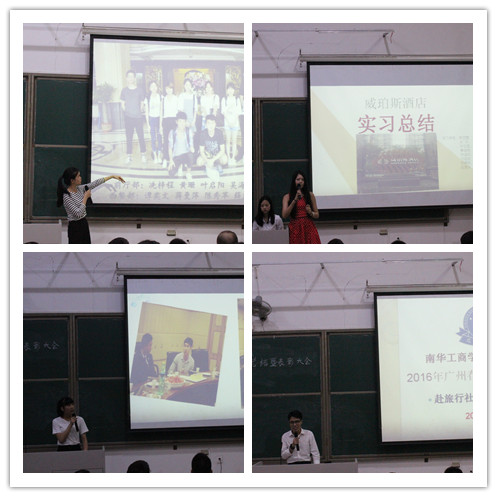 活动分为两部分,第一部分是2015-2016实习总结汇报。根据人才培养方案、教学计划,14级白云班于2015-2016学年第一学期到白云国际会议中心开展了为期半年的顶岗实习,14级旅游管理班、酒店管理班于2016年4月起开展为期一个月的春交会实习。本次春交会实习中,88名同学分别到了广州保利假日酒店、白云万达希尔顿酒店、广州科尔海悦酒店、广州颐和盛世、裕通大酒店、远洋宾馆、威珀斯酒店、中国市长大厦以及旅行社开展实习活动。在汇报中,同学们纷纷感谢学校以及企业给予的帮助和支持,通过亲身的实践,提高了自身的专业素质,变得更有自信,向职业人的路径出发。