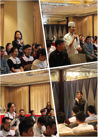 13日下午,在酒店方的安排下,李河川书记一行为所有在澳门葡京酒店就业的南华工商学院51名莘莘学子举办了座谈会。会议由胡家夏主任主持,同学们见到了学院领导和老师们的到访纷纷激动不已,表示毕业后还能得到学院的关注和关怀深感幸福和感动。会谈开始,烹饪班吴怡淑同学向在座的老师们娓娓道来他的一年成长历程,从不适应到享受工作的过程,并为自己能够在世界顶端的米芝莲3星级餐厅厨房工作感到万幸,他表示自己一直努力以高标准严要求自己,利用休假时间主动学习,今年初考取了澳门的高级烹调师和高级营养师等资格证,决定珍惜锻炼的平台,愉快地在酒店工作下去。接下来,同学们纷纷争着与老师们分享他们到澳门葡京酒店工作以来得到的关怀、尊重、学习、历练、快乐和财富,他们感恩酒店给他们提供很多培训的资源和锻炼机会,同时感谢学院给予的优质就业平台和传授了扎实的专业知识,也训练了他们良好的职业素养,同学们认为学院的“求真务实、勤恳好学、健康和谐、儒雅自尊”的校训一直支撑着他们时刻以南华学子的精神面貌对待学习和工作。同学们谈毕,易江院长对各位发自肺腑的总结感到高兴,感悟到了每个学生的健康成长。接着易院长从农业经济时代、工业经济时代和服务经济时代的不同进行分析服务工作的要求,并提出同学们必须以“安其位、尽其责、持以恒”的心态对待服务经济时代的现代服务业工作,要求同学们对岗位培养兴趣,身怀感恩之心,珍惜每一份工作,遵守职业道德和职业规则,出于污泥而不染,扎扎实实地干好自己值得干的事业,发挥互相帮助的文化,在成长的台阶上尽可能将绊脚石变成垫脚石,在事业有成时获得持以恒的幸福感。李河川书记用“三个没想到”展开发言,第一是没有想到在澳门同一家酒店有南华工商学院如此多学生;第二是没有想到酒店提供了如此好的保障给同学,包括吃、住、收入和培训等方面;第三是没有想到酒店给予学生提供如此好的展示才华的舞台,让学生感到温暖、温馨和成长。会中李书记代表学院感谢葡京酒店让校企合作达到双赢状态。最后李书记对同学们提出三个要求:第一是忠诚自己的职业选择,利用最顶级的酒店集团和国际化的平台锻炼自己,认真对待,为人生出彩和价值观体现提供平台,引用孔子的话“天降大任于斯人也,必先苦其心志,劳其筋骨,饿其体肤,空乏其身”勉励大家走好每一步,为人生打好基础。第二强调学生进入南华开始,一生都打上了南华的烙印,学校培育了学生,但同时南华也以学生为荣,希望同学们记住南华、热爱葡京,发挥才华。历时两个小时的座谈会在愉悦交流后结束。