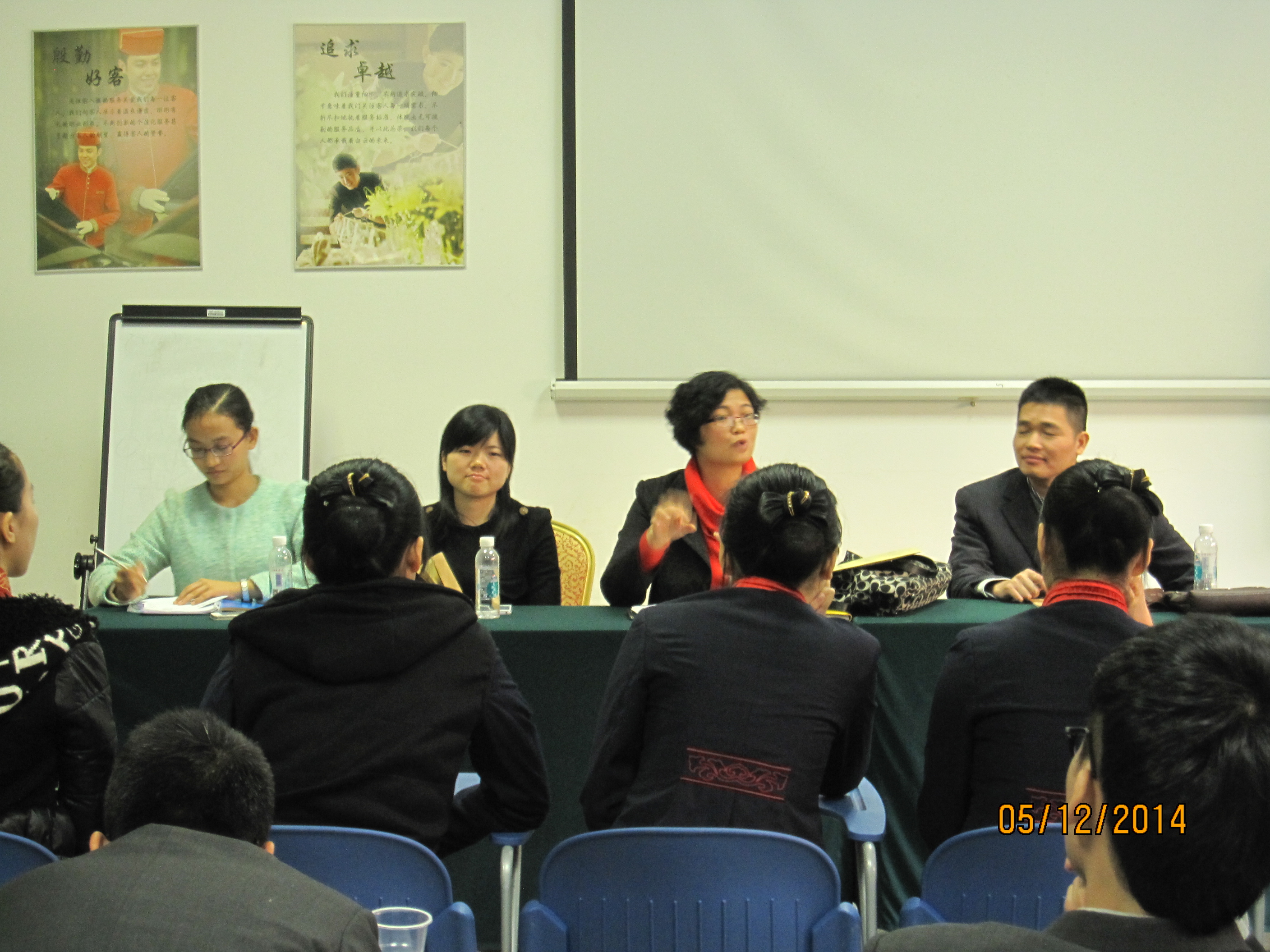 座谈会中,分别在礼宾部、营业部、宴会部、安保部、康乐中心等各部门执行实习任务的同学都分享了在各自岗位上的工作心得,对各自的工作都抱有热忱。从刚开始的应付不来到现在的工作上瘾,虽然疲惫,但也夹杂着快乐。同学们也领会到,要学会做事,离不开学会做人,明白人际关系在工作中的重要性。谭金凤副主任肯定了13级白云班的同学在顶岗实训期间的优秀表现,并现场就学生提出的专业问题一一解答,在聆听学生实训见闻时,谭副主任结合不同岗位的学生布置了不同的实训学习任务和作业,鼓励大家争取主动学习酒店其他岗位的技能,收集实训中的正反客户案例素材,并用思考的习惯对待每天的实训,用专业的知识应对客户的服务需求等,结束座谈会前还嘱咐同学们学习中勿忘安全,同学们要互相关爱等。