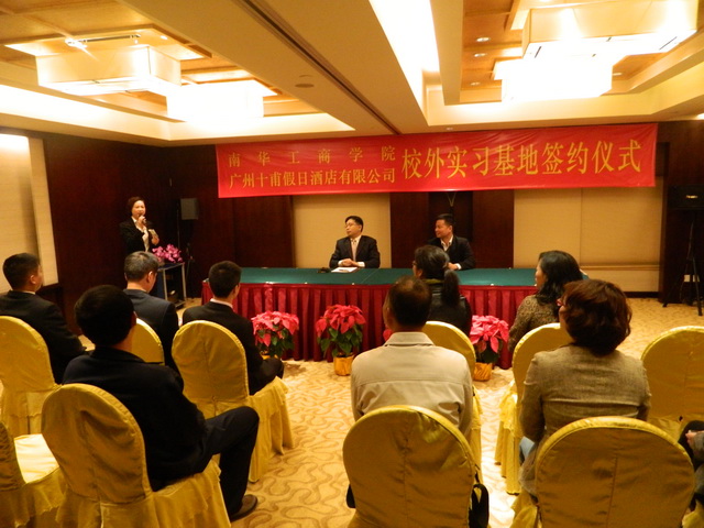 12月7日下午,旅游管理系与广州十甫假日酒店举行校外实训基地签约暨挂牌仪式成功举办。广州十甫假日酒店财务总监李启明、各部门经理,学院招就办黄玉良主任、旅游管理系胡家夏主任、谭金凤副主任及张树清、陈丽芳、方永航、吴双丽老师出席了该仪式。仪式由十甫假日酒店人力资源总监王英主持。