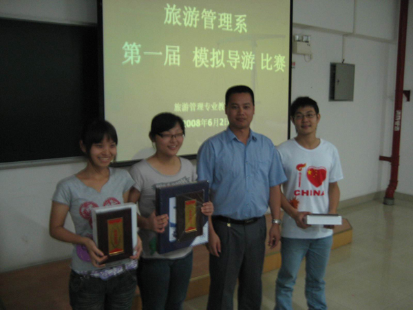 经过激烈角逐,07涉外旅游管理班黄晓雯同学脱颖而出获得金奖,06旅管1班沈永悦、07旅游管理班黄小燕同学分获银奖和铜奖,叶东霞、吴明芸、范旭立、沈燕、梁绮华同获优秀奖。