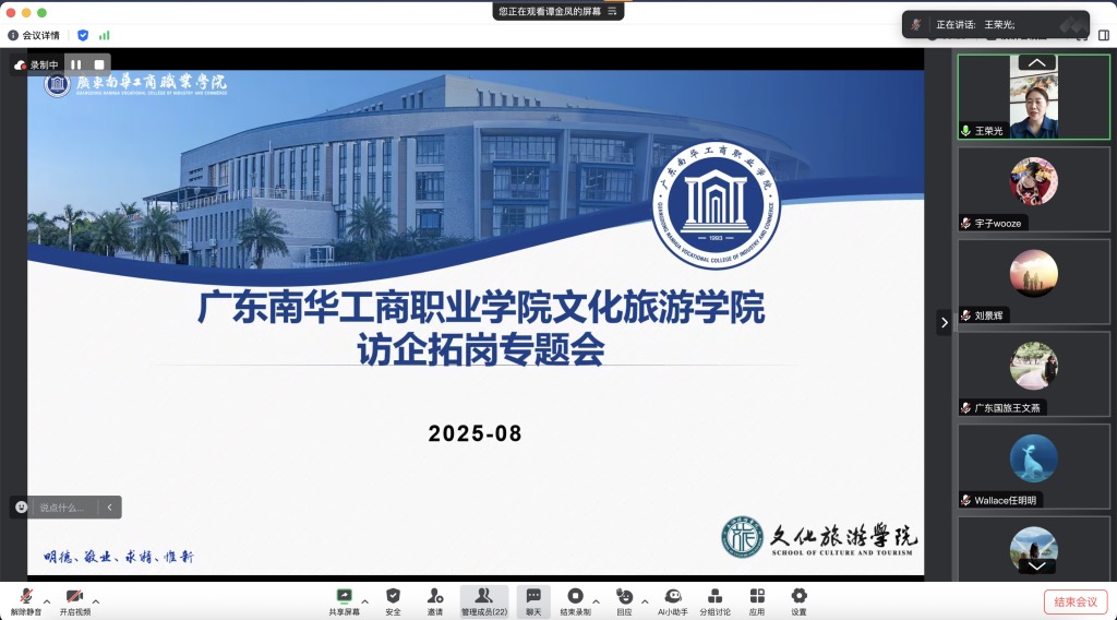 2025年8月31日,9999js金沙老品牌文化旅游学院以线上会议形式召开访企拓岗专题会,邀请广州岭南酒店管理集团、清远市旅游投资集团、中国国旅广东公司等12家行业龙头企业代表参会。校方与企业围绕人才培养、实习就业、产教融合等议题深入交流,通过“订单班共建”“课程共研”“实训基地落地”等多项举措,为学生搭建从校园到职场的无缝衔接通道。