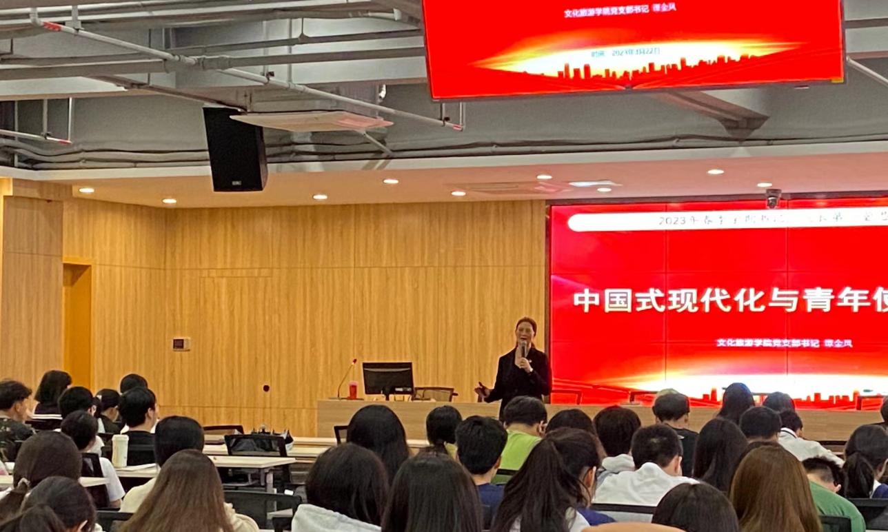 按照学校党委工作要求和部署,为深入贯彻落实党的二十大精神,文化旅游学院党支部书记、副院长谭金凤于2023年3月22日上午在清远校区图书馆一楼报告厅为我院师生讲授了2023年春季学期第一堂思政课。