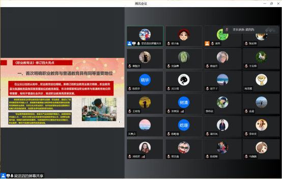 会上,梁滔滔副院长从职业教育法的出台背景、立法进程、修订亮点等方面,对新修订的《职业教育法》进行领学与解读,重点阐释《职业教育法》中有关突出就业导向、坚持立德树人、推动与普通教育融通贯通、明确扶持措施、提高社会认可度、完善保障等内容。