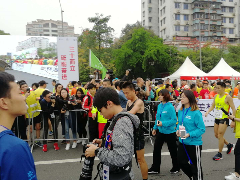 图五:志愿者为全马第二名选手斯国松服务