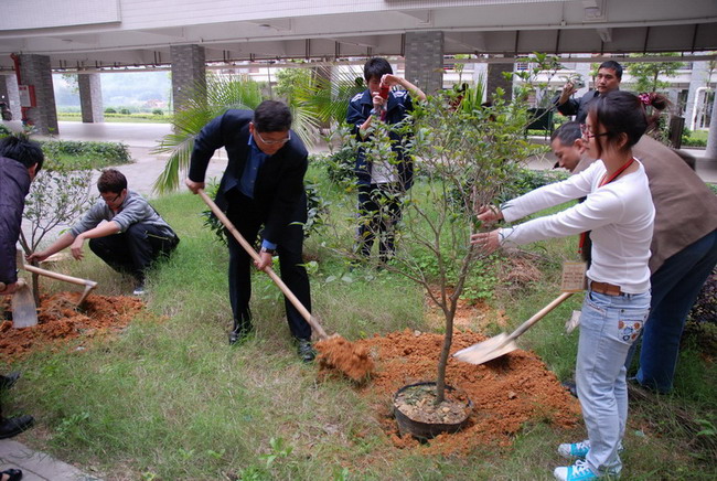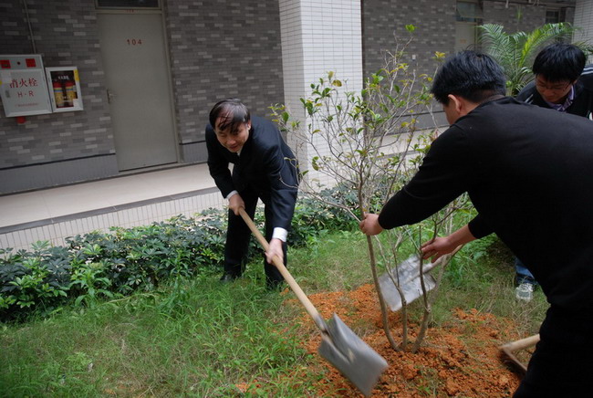 参加此次活动的有学院党委李河川书记、学院院长易江博士、清远校区综合办主任郭记中教授、综合办副主任唐宏强、院团委副书记陆飞宇、学生处蔡文军、院团委黄仲山、清远校区各系辅导员老师,以及旅游管理系黄玉良主任、胡家夏副主任、清远校区2009级全体学生。 活动由植树仪式和现场植树两部分组成。11点30分,植树仪式正式开始。首先,学院院长易江博士为本次活动致辞,他讲到:“山不在高,有仙则灵;水不在深,有龙则灵;人不在多,有心则灵;树不在多,有心则行。今天我们在这里举办植树活动,虽然不是轰轰烈烈的大事,但是这体现了大家对南华的一片学子之心,让我们看到了旅游管理系师生为清远校区绿化建设作贡献的美好意愿。他希望在场的师生能够热心工作,用心学习,用实际行动体现“爱我南华”的精神。易院长的讲话极大地鼓舞了旅游管理系全体师生,赢得了阵阵热烈的掌声。随后,旅游管理系黄玉良主任宣布植树活动正式开始,并邀请领导与嘉宾到2栋宿舍楼下植下桂花树。