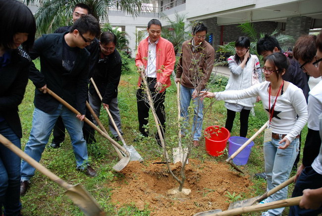 暖风吹得人人醉,春风已绿岭南天。2010年3月30日上午,旅游管理系(清远校区)在清远校区宿舍楼下进行了“爱我南华,美我家园”的植树活动。