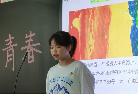 砌五四,立足当下,“百年未有之大变局”波澜壮阔。通过观看学生、医护人员、奥运健儿、边防战士等人的事迹,了解何为青年。视频中习近平总书记强调:新时代中国青年要以实现中华民族的伟大复兴为己任。刘帅波、王雨同学朗诵《红色》。入团积极分子余庆城围绕青年人要明确目标,敢于最求梦想,努力奋斗进行演讲:我们正处在国泰民安大有可为的时代,面对星辰大海之征途,肩负振兴中华使命,吾辈青年更将有“泰山崩于前而面不改色”的勇敢无畏精神。点燃心中无限燥火,照亮人生灿烂前途。