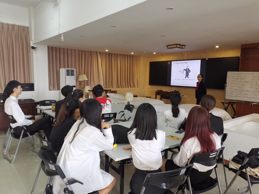 2020年10月30日,广州凯悦酒店集团的现代学徒制导师——君悦酒店人力资源部副理陈燕和房务部服务教练陈炬冉,在我校清远校区餐饮实训室、前厅实训室为2019级酒店管理专业君悦、柏悦现代学徒制班11名学徒授课。