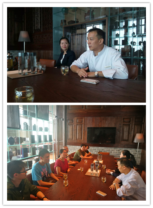 在酒店会议室内,酒店行政副总厨邹军先生热情地接待老师一行。双方从中国酒店业的发展趋势、经营思路、运营成本、市场需求的变化等多个方面展开了热烈的讨论。针对员工的招聘和培训,邹副总厨详细介绍了往年实习生的的培养情况、厨师招募和人才储备形式,张树清老师作为专业负责人对目前正开展的学徒制等学生人才培养方案作了介绍,双方就目前职业发展的新形势交换了意见。而后,邹副总厨答应了老师们的盛情邀请,将到学校为学生授课开讲。
