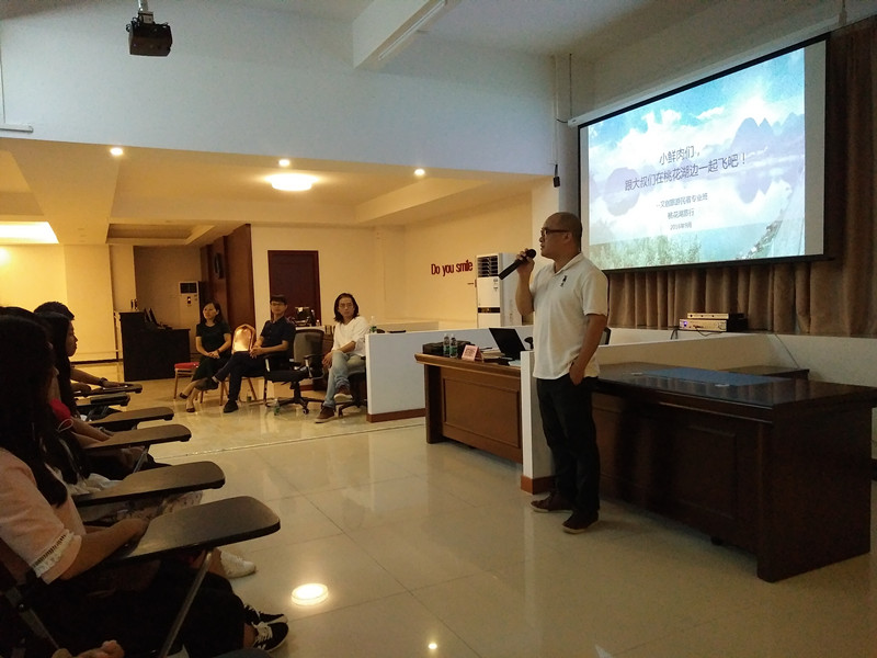 桃花湖旅行创始人刘荣给学生介绍了文创旅游民宿专业班的师资优势,这个班有一支强大的客座教授和导师团队,导师们将用自己丰富的实践经验引导学生深入地了解某个领域,成为专业人才。