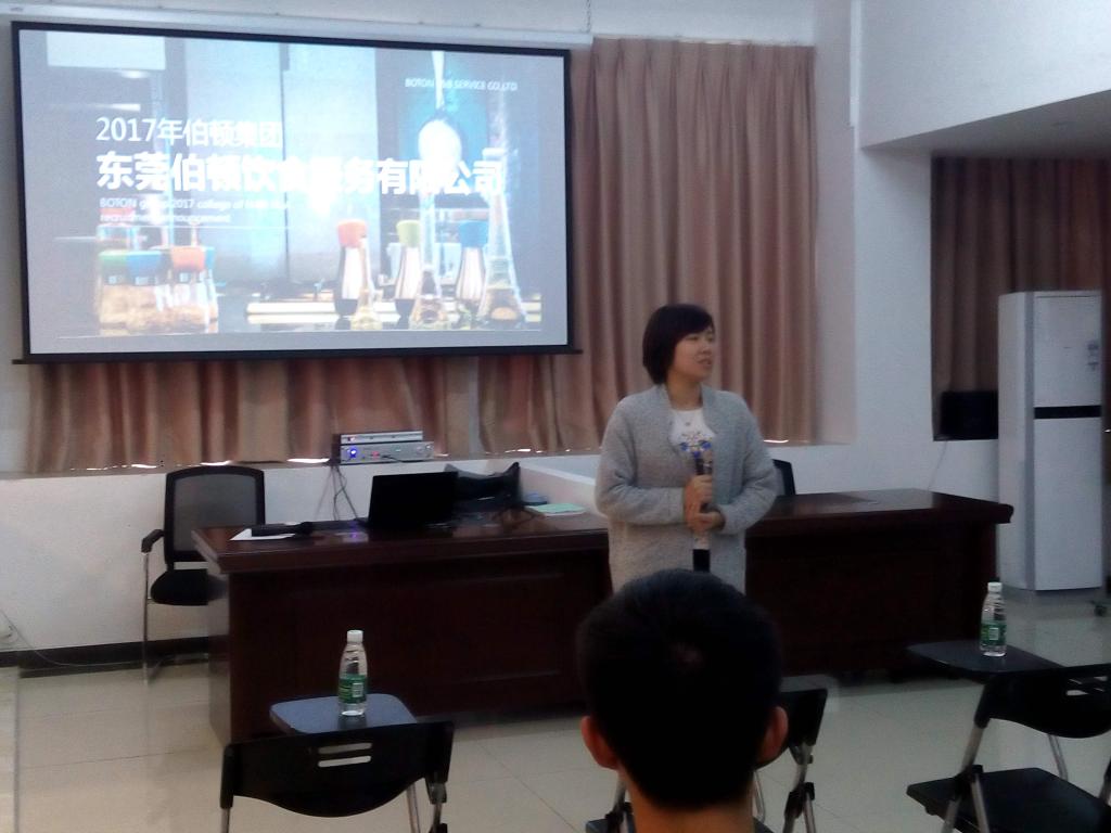 为了更好地开展校企合作,促进企业人才库的扩展,提供更好教学实践的机会,提升学生专业训练成果,17年3月3日,东莞伯顿饮食服务有限公司行政总监陈国凤、区域经理符翼、人力资源部经理黄丽梅一行三人到清远校区与16级伯顿储备干部班(以下简称:伯顿班)学生见面。旅游管理系谭金凤副主任、杨小衡老师、黄隽老师一同出席。见面会伊始,谭金凤副主任介绍了我系“伯顿班”的办学历程。随后,由行政总监陈国凤女士向学生们介绍了企业的集团品牌、企业文化、校企合作模式、伯顿储备干部发展规划、员工福利等多个方面。企业文化中,“家文化”吸引了学子们向往的心。