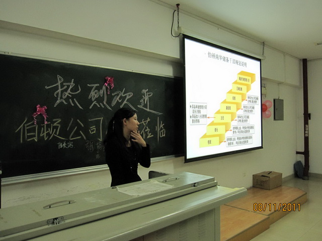 会上,人事专员黄丽梅详细介绍了伯顿饮食服务有限公司企业文化和培养干部的步骤,在半个小时的讲解中,同学们充分感觉到企业非常重视员工发展,重视储备干部班,这种良好的企业文化氛围给同学们留下了深刻的印象。同时,同学们还提出了将来在企业实习工作期间的食宿、在公司晋升空间、公司考核、公司福利、语言要求等问题,陈国凤主任对此给予了耐心详细的解答,对同学未来充满了信心。谭金凤副主任寄语激励学生好好学习专业知识,掌握过硬的本领,早日成为公司的管理者。