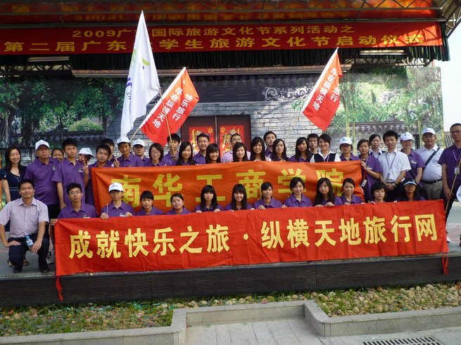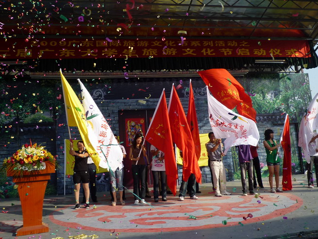10月18日下午,作为2009广东国际旅游文化节系列活动之一的第二届广东省大学生旅游文化节,在广州大学城岭南印象园正式启动。旅游管理系旅游管理专业教研室主任梁滔滔老师、系秘书吴双丽老师,带领08级旅游管理专业学生参与了启动仪式的会务组织工作。