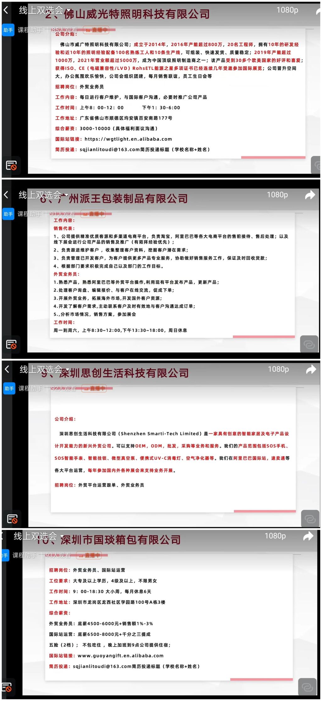 为了实现外院2024届毕业生“人岗精准匹配”的高品质就业,2023年12月26日下午,外语外贸学院联合阿里巴巴(中国)网络技术有限公司成功举办阿里巴巴国际站(跨境电商)线上专场双选会。此次人才双选会通过钉钉线上直播的形式进行,共吸引来自广州、深圳等珠三角地区的10家阿里巴巴国际站金牌优质商家参加我院的专场双选会,本次双选会招聘企业共提供外贸业务员、外贸运营助理、跨境电商运营、外贸平台运营跟单等超过50个招聘岗位。我院国际经济与贸易、商务英语、国际商务、关务与外贸服务、现代物流管理、应用英语、商务日语等专业近100名毕业生参加了双选会。
