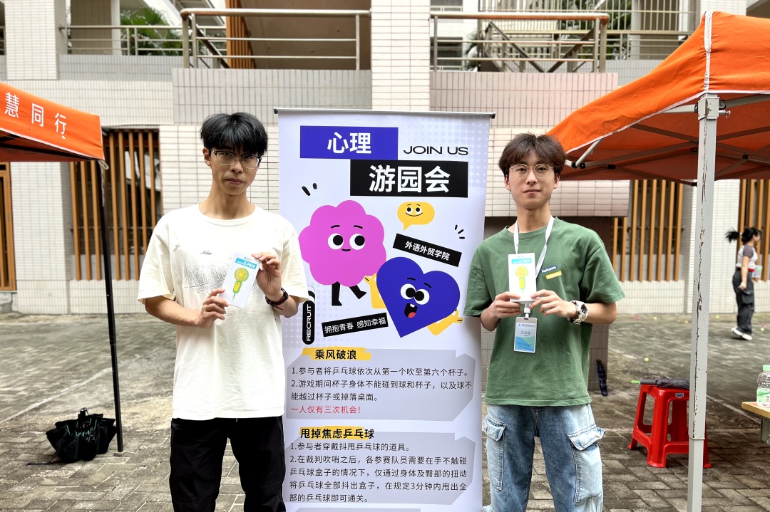 为进一步促进师生的心理健康教育,提高师生的心理抗压能力,引导师生关注心理健康、增强幸福感和自信心,2024年5月17日,由我校学生工作处主办的"5·25心理游园会"于清远校区学生宿舍4栋前空地处举办,其中“乘风破浪”“甩掉焦虑乒乓球”游戏项目由外语外贸学院承办。