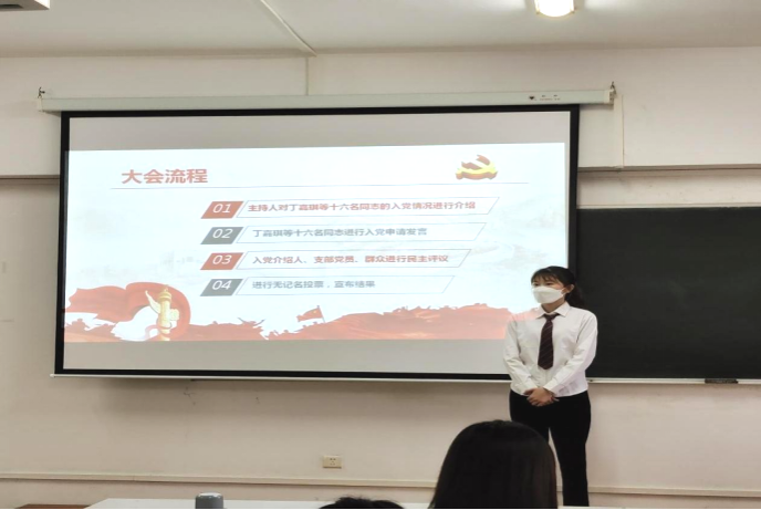 2022年10月9日,外语外贸学院学生党支部在黄埔校区C401A举行关于吸收丁嘉琪等十六名同志为中共预备党员的支部大会,9名支部正式党员、丁嘉琪等十六名同志以及入党培养人参加了本次会议。会议由支部书记汤湘湘同志主持,介绍了会议流程。