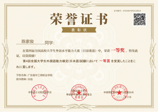 商务日语专业学生参加第四届全国高校大学生外语水平能力大赛,在来自全国160余所高校的8千余名参赛选手当中。喜获得一等奖2名,二等奖1名,三等奖5名的佳绩。