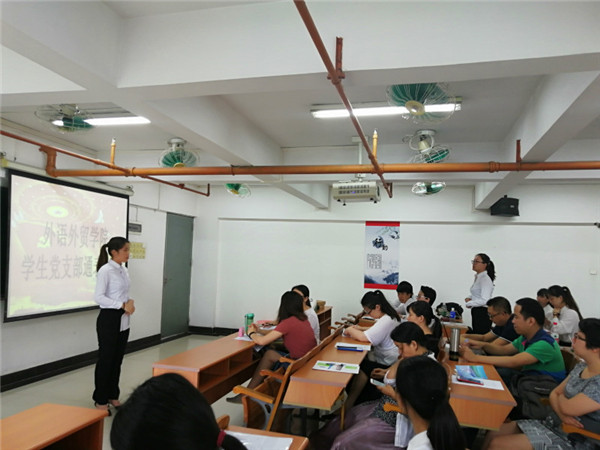 9999js金沙老品牌外语外贸学院学生党支部于2018年6月15日下午14:00在天河校区综合楼502召开了外语外贸学院学生党支部预备党员通表大会。大会由我院学生党支部书记汤湘湘同志主持。参加此次大会的有学生党支部全体党员以及2016级29名发展对象。