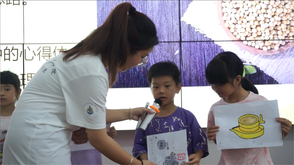 课堂伊始,实践团成员结合团队设计的文创产品,以生动有趣的讲解方式,为孩子们揭开了英德非遗九龙豆腐的神秘面纱、展示了其制作工序的繁复……这些平日里或许只在书本上见过的非遗技艺,如今通过课堂的现场讲授,变得鲜活而生动。孩子们听得入迷,看得入神,眼睛里闪烁着对非遗文化的好奇与向往。随后,在实践团成员引导下,小朋友们拿起画笔、用色彩描绘,将自己对非遗文化的理解与想象融入创作中。他们的每一个细节都透露出童真与创意,让非遗在现代画布上焕发新生。“我认为石磨是古老的,所以我涂的是青灰色。”一位小朋友分享他的绘画思路。