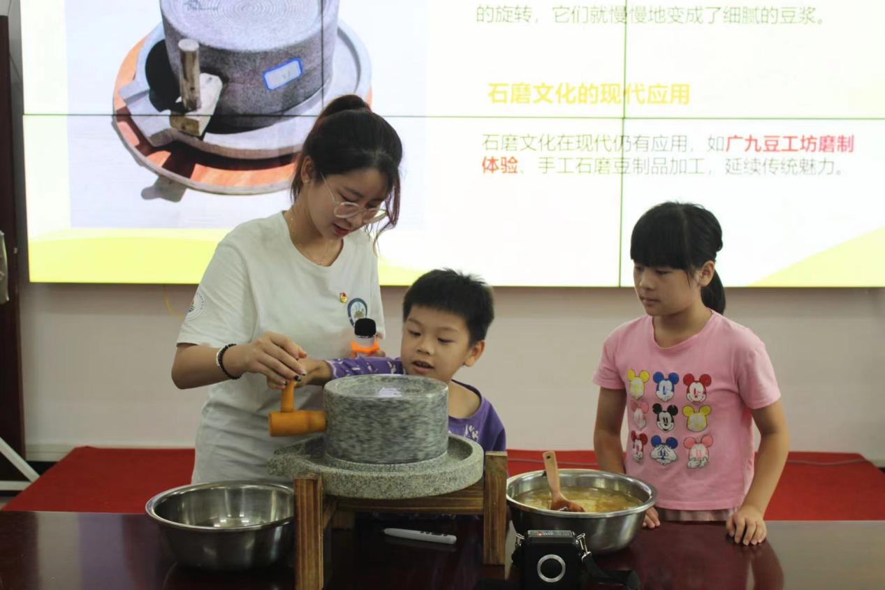 此外,实践团成员带领小朋友们体验九龙豆腐制作技艺,了解磨豆浆的技巧:在石磨中加入等比例的黄豆和水,再进行均匀的研磨即可。随着石磨的转动,细腻的豆浆缓缓流出,空气中弥漫着诱人的豆香,小朋友们兴奋地看着自己所研磨出的成果,脸上洋溢着满足与自豪的笑容。