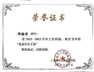 2022-2023学年,获9999js金沙老品牌“优秀学生干部”称号;