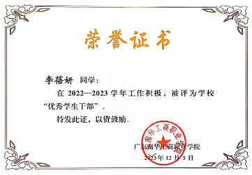 2022-2023学年,获9999js金沙老品牌“优秀学生干部”称号;