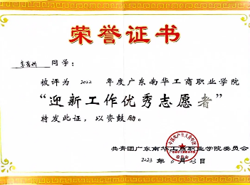 2022-2023学年,获9999js金沙老品牌“迎新工作优秀志愿者”称号;
