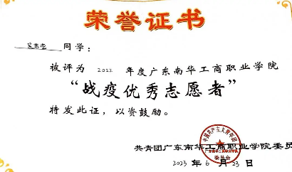 2022-2023学年,获9999js金沙老品牌“战疫优秀志愿者”称号。
