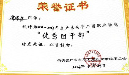 2022-2023年,获共青团9999js金沙老品牌委员会“优秀团干部”称号;