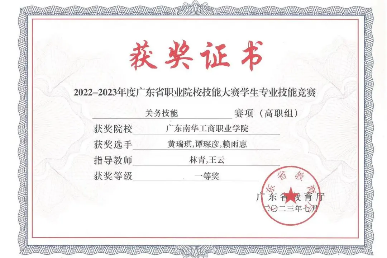 2022-2023年,获广东省职业院校技能大赛学生专业技能竞赛关务技能赛项(高职组)一等奖;